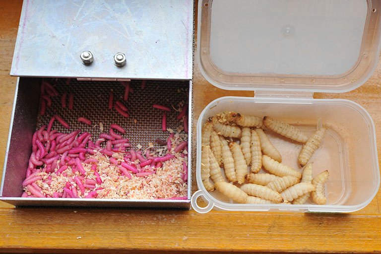 サシもしくは紅サシ(写真左)がよく使われる。通常は現地で販売されており、釣り場によってどちらがよく釣れるといった傾向が出る場合もある。アカムシは濁りが入った時に使うと効果的。ブドウムシ(写真右)はハリに刺すのではなく、カットしたものを仕掛けの上部に取り付けて魚を寄せる目的で使う。