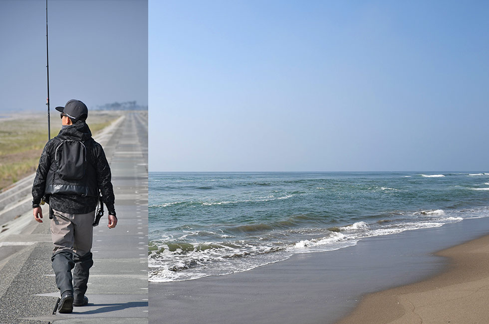 そして、実際に釣り場に立ったら、まずは土手や防波堤など少し高い場所に立って、地形の変化や海の状況を観察する。広大なサーフはやみくもにルアーをキャストしても魚に出会える可能性は非常に低く、「釣れそうな場所」を自分の目で絞り込んでいくことが大切だ。