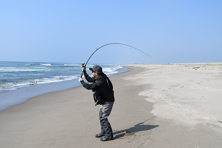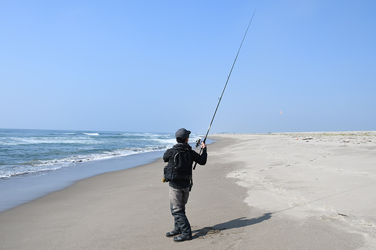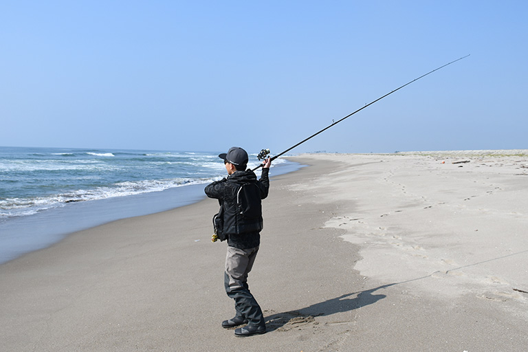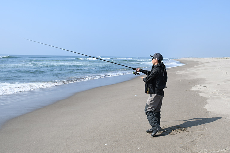 キャストはできるだけ遠くにルアーを飛ばすフルキャストが基本になる。おすすめは「振り子投法(ペンデュラムキャスト)」だ。詳細は別記のとおりだが、ぶら下げたルアーの遠心力を利用してロッドを大きく曲げる。周囲に障害物がないサーフのメリットを生かしたキャスト方法でもある。