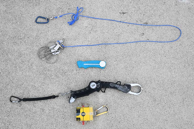 は鋭い歯があるのでフィッシュグリップで掴む。そのほかには大きさを測れるメジャー、魚の口からルアーを外すプライヤー(ルアーの交換に使用できるリングオープナーが先端に付いたもの)などを使う。また、暗いうちから釣りをする場合はヘッドライトも忘れずに。魚を持ち帰る場合は、血抜きをするためのナイフ、魚をキープしておくための