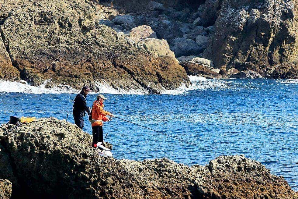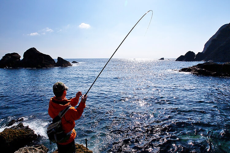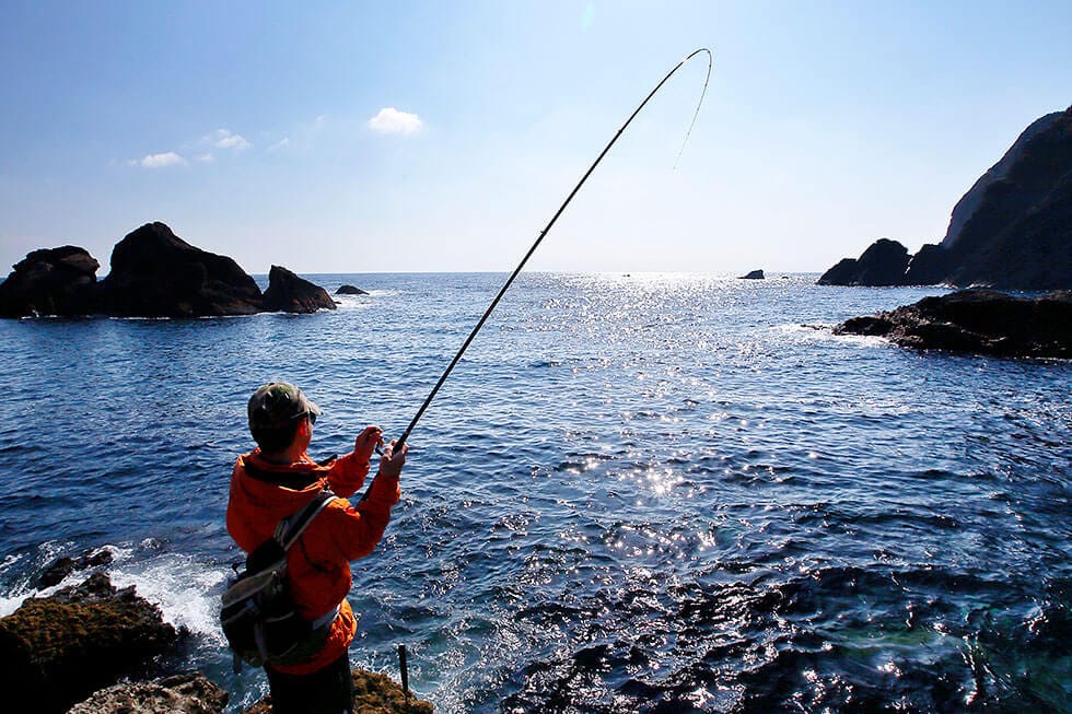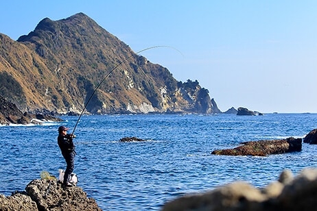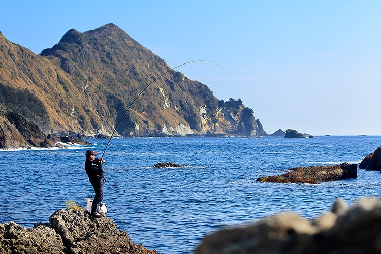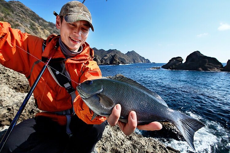 地元の名手が磯でメジナをねらっているという。