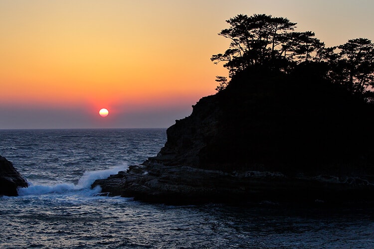 堂ヶ島の入り江に浮かぶ島々の間に、丸い太陽が沈んでゆく。