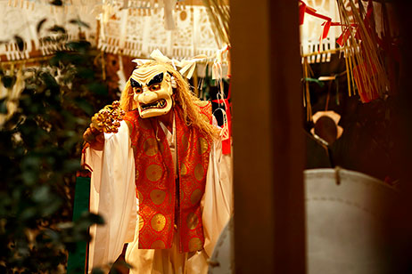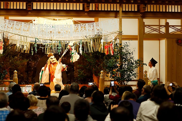 高千穂神社では、本来33番ある神楽舞のうち4番を毎晩ここで観光神楽として見ることができる。