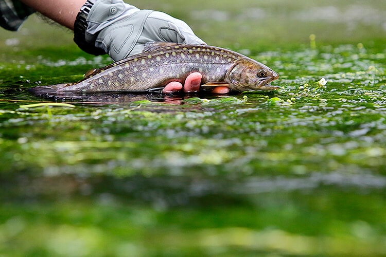 バイカモの上を滑らせるようにして寄せ、尺近いイワナをネットに収めた。