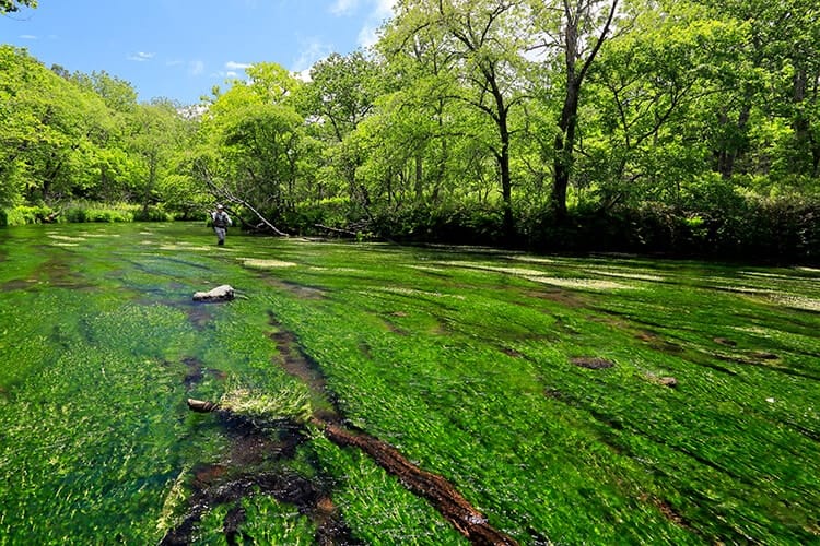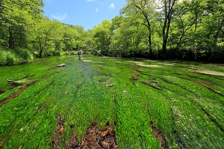 湧水の澄んだ流れに、場所によっては一面埋め尽くすように生えたバイカモ。