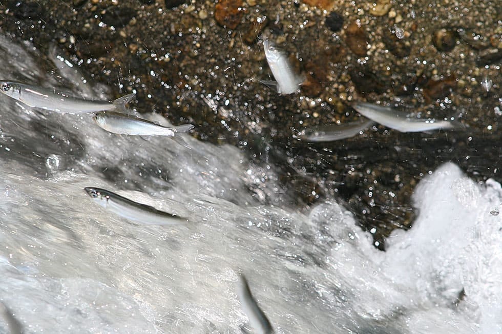 これらの魚は、実は海と山をつなぐ大切な役目も担っている。アユなどの遡上魚は、海の栄養素を川の上流まで運ぶ。そこで鳥や獣に食べられ、その食べ残しやフンなどは森の栄養になっていく。