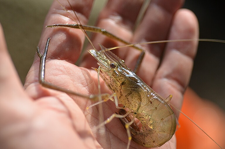 テナガエビは夏が繁殖期。5月頃から始まって、じめじめと蒸し暑い梅雨をピークに、オスとメスが河川の下流部の浅い場所に集まって産卵する。そして、生まれた幼生は川の流れに乗って、海まで下ってから、植物プランクトンなどの有機物を食べて成長する。育った稚エビは自分の力で川を歩いて遡り、また川で暮らすようになるが、冬場は水温変化の少ないやや深い場所で過ごす。その成長には健全な川と海のつながりが欠かせないのである。