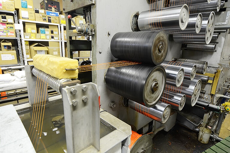 現在、釣りイトは「ナイロン」から始まった化学繊維の時代を迎えている。ナイロンは樹脂のチップが原料。いわゆるプラスチックを熱で溶かして押し出すことでイト(原糸)にしたものだ。原料を変えることで、「フロロカーボン(フロロ)」「エステル」といったラインも作られている。ナイロン、フロロ、エステルはそれ自体が1本のイトである「単線(モノフィラメント)」構造である。