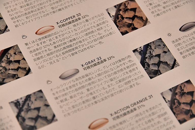 偏光レンズにはさまざまな色があり、それに加えて濃紺もだいじな要素。色や濃さはパッと見ても分かるが、カタログなどに記載されている“可視光線透過率”でも判断できる。これは光を通す割合のことで0%から100%で表わされる。その数値が低いほど眩しさをカットしてくれるが視界は暗くなり、反対に数値が高いほど眩しさのカットは減るが視界は明るい。