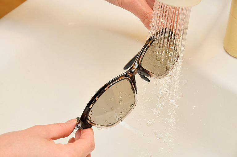 細かな埃も侮ってはいけない。釣りのときに付くのは砂塵などの場合が多く、そのまま拭き取るとレンズに傷が入る恐れがある。そこで、水で洗い流してからメガネクロスなどの柔らかい布やティッシュ、もしくはキッチンペーパーで水分をしっかりと拭き取る。