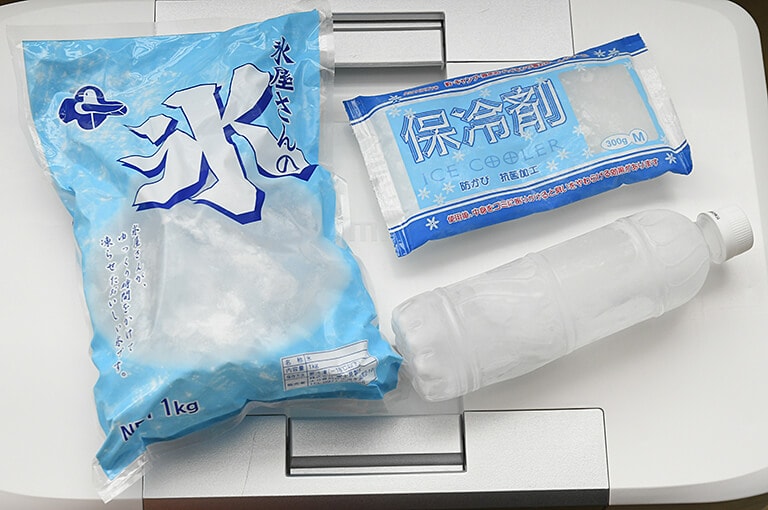 クーラーボックスを冷やすには厚手のビニール袋に入った氷や保冷剤、またはペットボトルに水を入れて凍らせたものを使う。