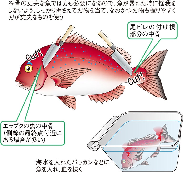 刺身でいただきたい魚は、釣りあげたその場で生き締めにして血抜きを行なうのが、鮮度を保つ最高の持ち帰り方。魚はゆっくり死なせると、それだけ鮮度が落ちるからだ。