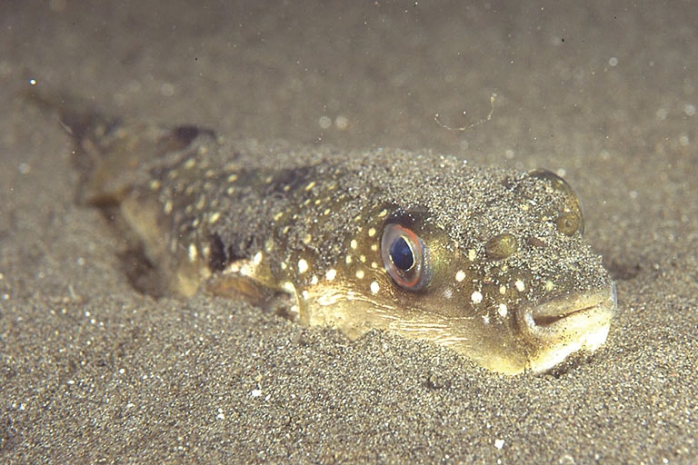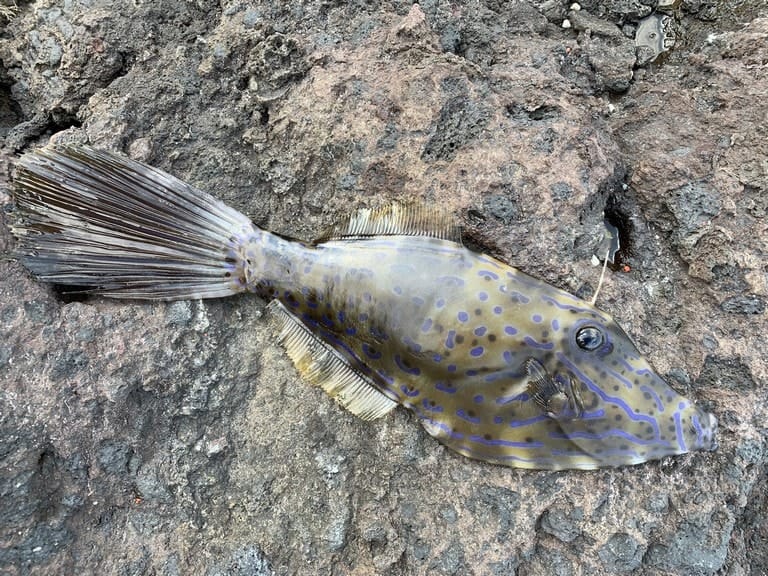 「パトリキシン様」毒ではなく、正真正銘のパリトキシンを消化管や内臓に持つことがある毒魚。家畜の死亡例があるが、体に多数の黒斑と虫食い状の青色斑が散在することなどから見分けは容易。南方系の魚で、関東・東北沿岸ではまれだったが、近年はよく見られ注意が必要。幼魚はしばしば流れ藻に随伴して岸辺に寄りつき、成魚は全長60cmになる。