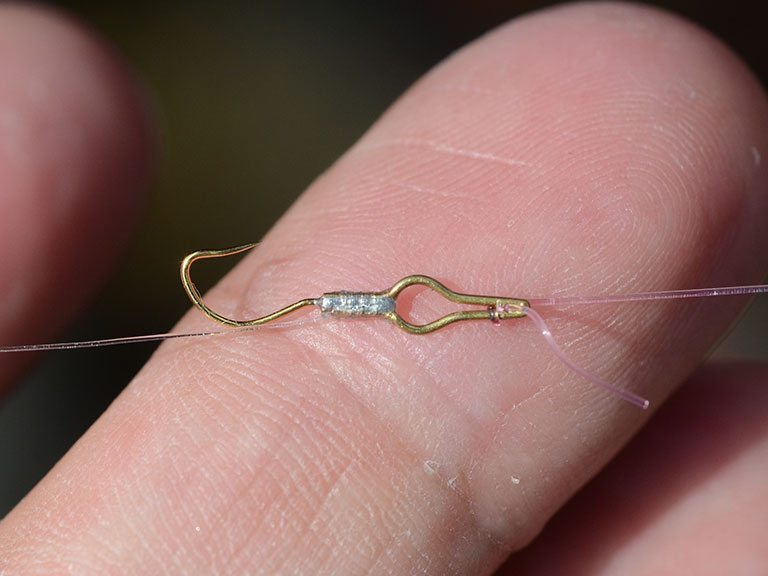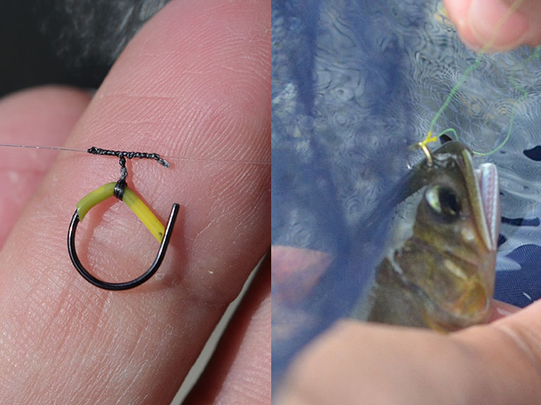 オトリアユを泳がせるため、基本的に他の釣りと比べても非常に細いイトを使います。先端部分はオトリアユを取り付けられるようになっており、ハナカンと呼ばれる金属の輪をオトリアユの鼻に通し、さらに逆バリと呼ぶ小さなクリップの役割を果たす金属パーツをオトリアユの尻ビレに引っ掛けて、その逆バリに他のアユを引っかけるためのハリス付きの掛けバリをセットします。