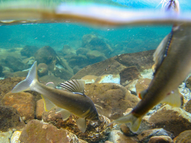 成長期に入ったアユの主食は、川の石に生える新鮮なコケです。水が澄んで陽光がたくさん降り注ぐ清流ほど、より良質なコケが生えるので、アユはどんどん上流を目指します。
