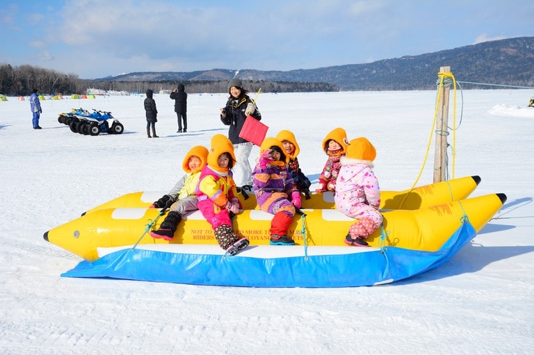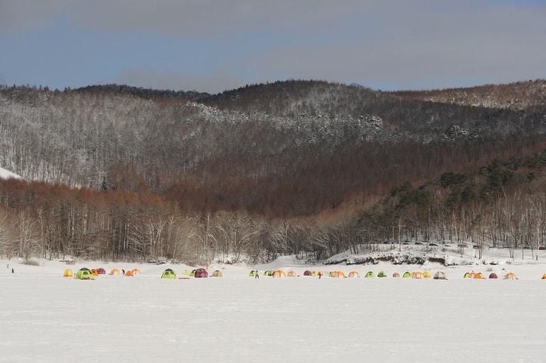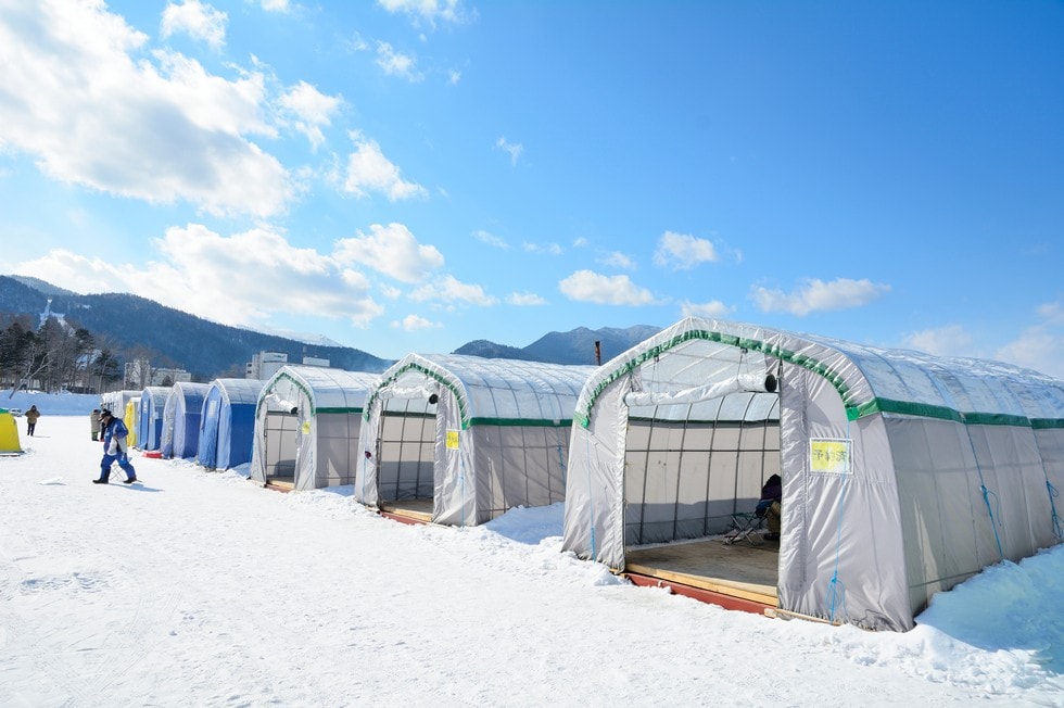 北海道東部の人気観光地として知られる阿寒湖は、早くから家族連れなどの受け入れに力を入れているワカサギ釣り場。湖にはビニール製のハウスやテントがずらりと並び、遊漁料、レンタル釣り具一式、釣れた魚を天ぷらにしてもらえる揚げ券がセットになった「ワカサギ釣りセット」も用意されています。釣れるワカサギは美味しく、氷上バナナボートなど釣り以外のアクティビティーも充実しています。