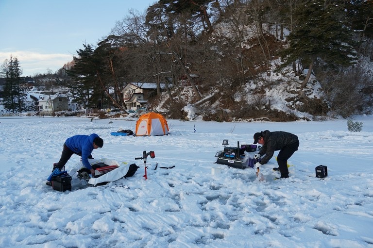 八ヶ岳連峰の山麓、松原湖高原にある猪名湖と長湖。猪名湖と長湖は道を挟んで隣り合わせになっており、ワカサギ釣りでは2つを合わせて「松原湖」と通称しています。 猪名湖は周囲が約2km、長湖は約1.3kmと、いずれも小さな湖ですが、湖が結氷する1月上旬から3月初旬頃まで氷上の穴釣りが楽しめます。湖畔には必要な道具一式(荷物を運ぶソリやテントを含む)を貸してくれる釣り施設が複数あり、また、この湖は水深が浅いので、手バネタックルというグリップにイトを巻いただけのシンプルな道具で楽しめるのが魅力です。