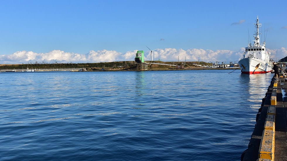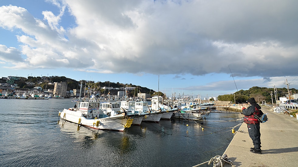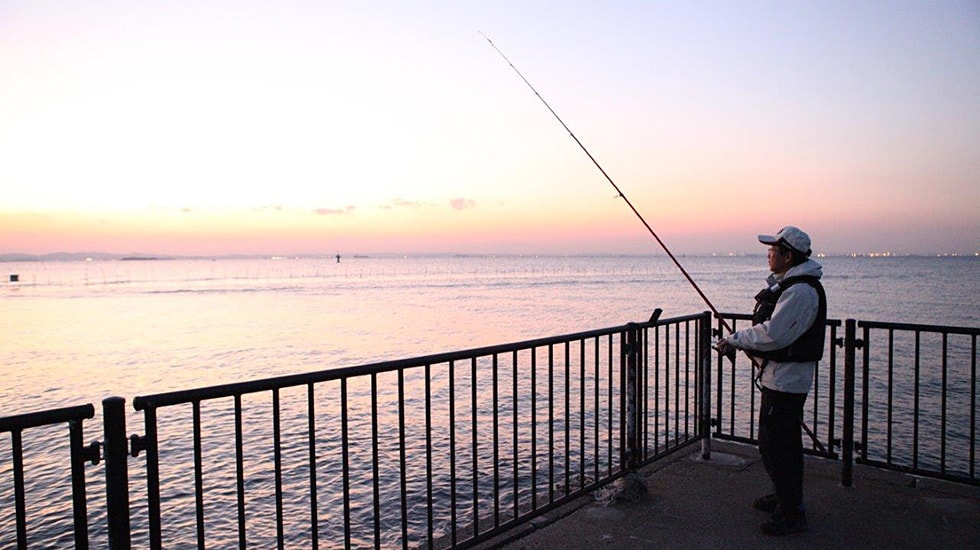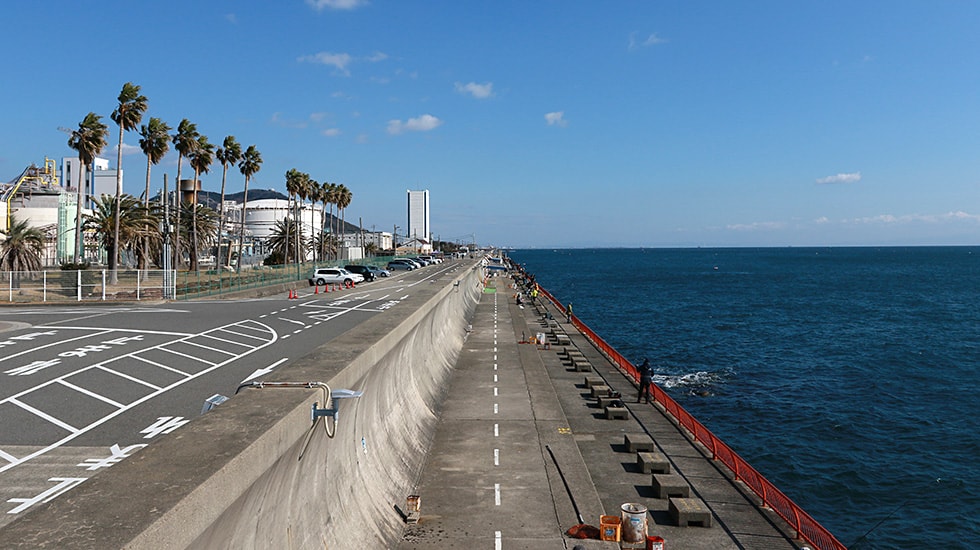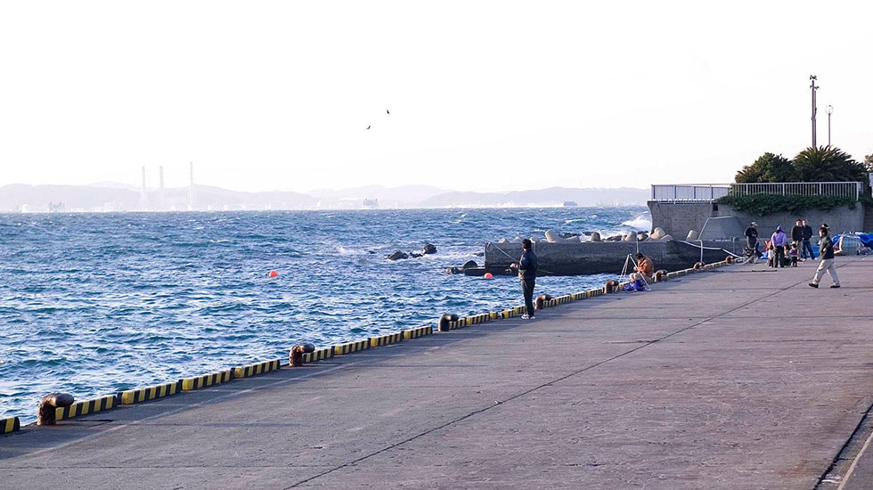 釣り場の向かい側がフェリーの発着所。足もとがよく、休日は多くの家族連れで賑わっています。明るい時間でも、フェリーの出入りによってできる水流で魚の活性が上がり、よい釣果が得られることも少なくありません。アジの回遊も見られるので、サビキ仕掛けを忍ばせておくのもおすすめです。