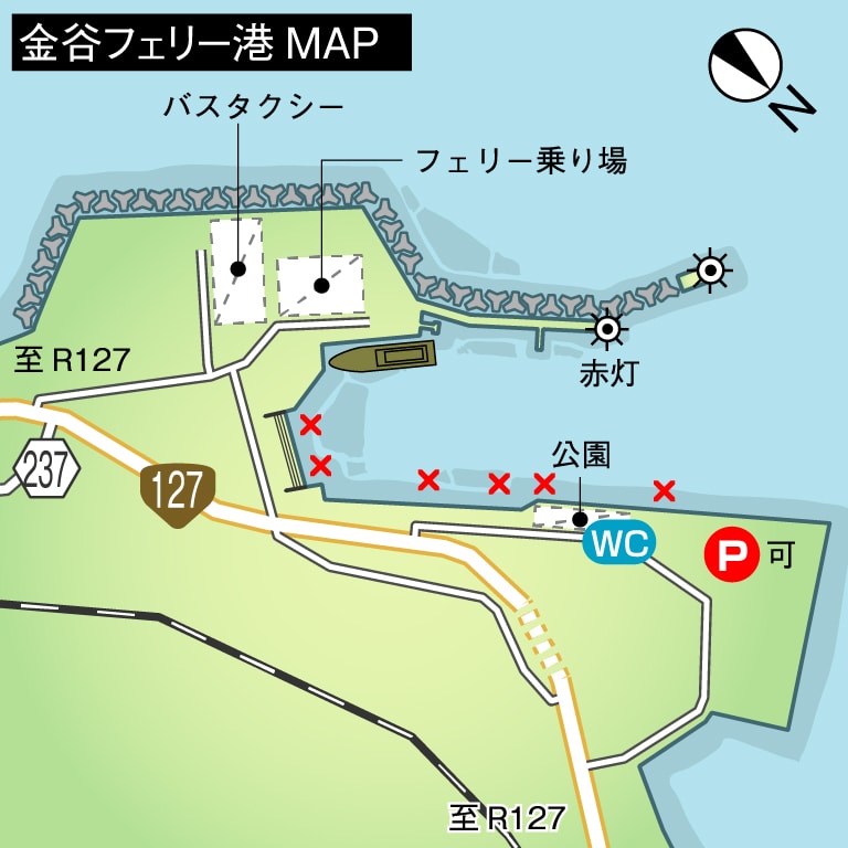 京葉道またはアクアラインを経由して、館山道・富津金谷ICを下車。R127を館山方面へ進み金谷フェリー乗り場へ。
