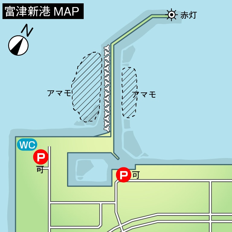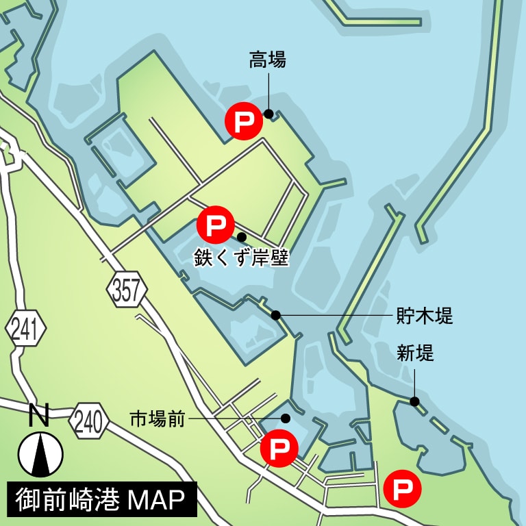 駿河湾の入口にある広大なメバル釣り場。人気があるのは「西埠頭高場(大型メバル)」や「鉄くず岸壁(中小型)」と呼ばれるポイント。後者は照明が海を照らす東端のフェンス際がよく、市場前から新堤にかけて点在する常夜灯の周りもチャンスです。広い釣り場なので、各所をテンポよく移動しながら釣ります。