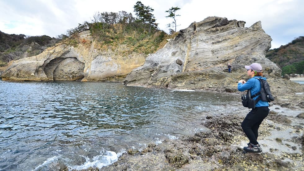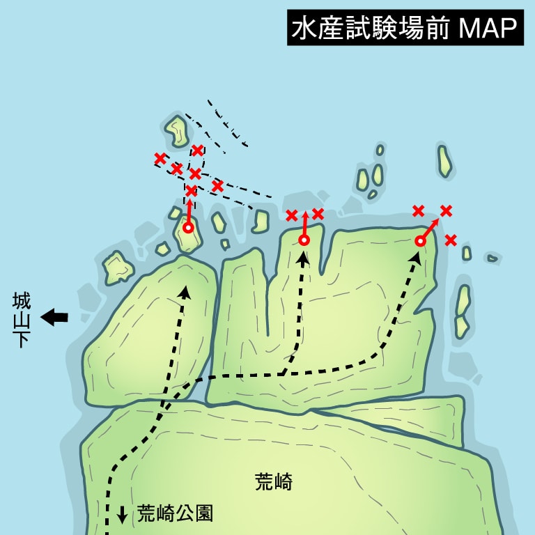 三浦半島にあって美しい海岸線で知られる荒崎海岸。荒崎公園の駐車場から歩いていける「水産試験場前」と呼ばれる場所は、クロダイやメバルが多くいます。岩場(根)と砂地が入り交じり、海の中はカジメやホンダワラといった海藻が生い茂っていて、周囲一帯が釣り場です。メバルは海草の切れ目のあたりに多くいます。