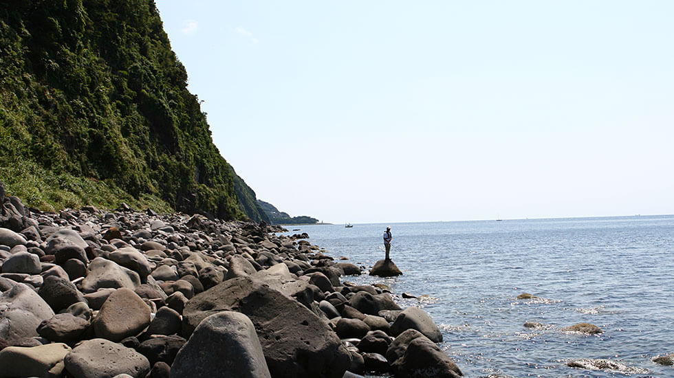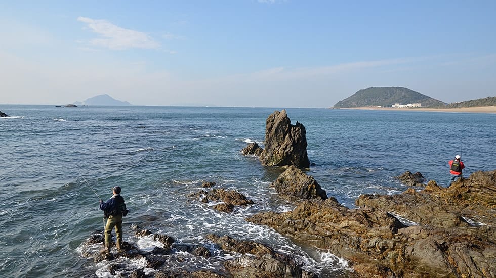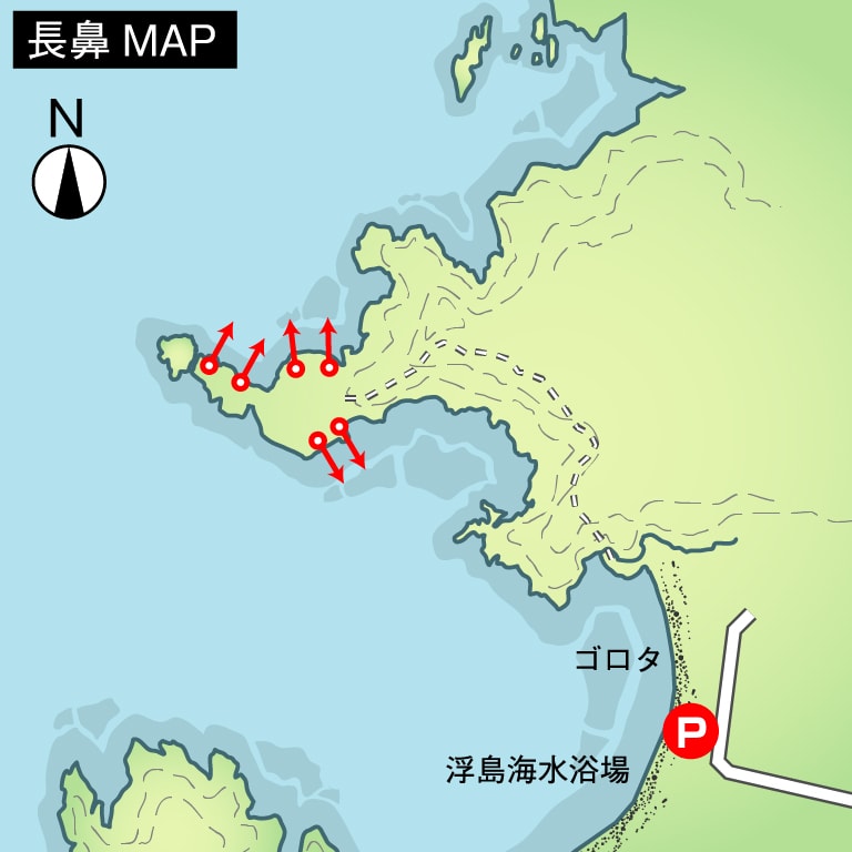 伊豆半島にある西伊豆町の長鼻は、磯釣りの渡船も行なわれている田子漁港のすぐ南に位置する、比較的足もとのよい地磯(陸から歩いて行ける磯)。青もの釣り場としても知られますが、大型のメバルもチャンスがあります。先端に小山がありますが、そこまで渡らず、手前の平らで足場のよい場所で充分釣れます。