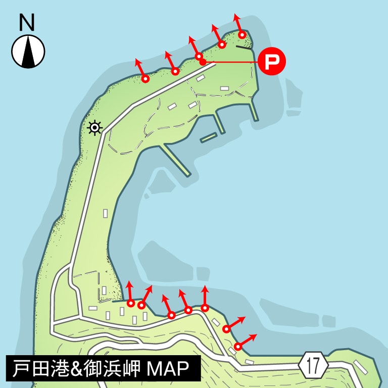 駿河湾に面した天然の入り江である西伊豆の戸田。港と港を守るように突き出た御浜岬は人気の大型メバル釣り場です。港は常夜灯周りに20cmを超えるメバルがいて、御浜岬は沖向きのゴロタ浜が釣り場になります。なお、港ではルアーを周りの船などに引っかけないよう、充分に注意して釣りをしてください。