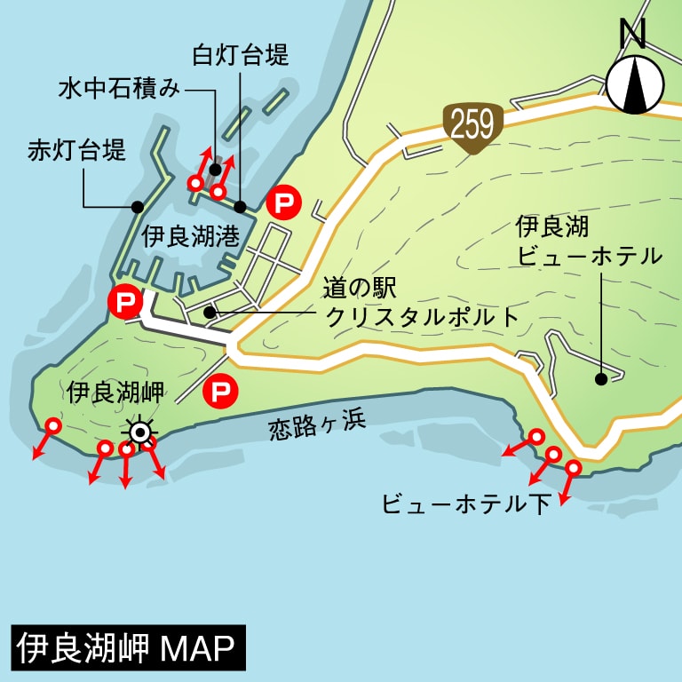 伊勢湾と遠州灘の堺に位置する伊良湖岬は、風向きに応じて釣り場を選べる人気のメバル釣り場。手軽に釣るなら伊良湖港のフェリー乗り場周辺や、白灯台堤から沖に沈む石積み堤をねらうのがおすすめ。伊良湖岬からビューホテル下にかけての遠浅な浜は、ウエーダーを着用して釣ります。北西風が吹く日は25cmクラスの良型が顔を出すビューホテル下の磯場と、根が点在する恋路ヶ浜から伊良湖岬にかけてがチャンスです。