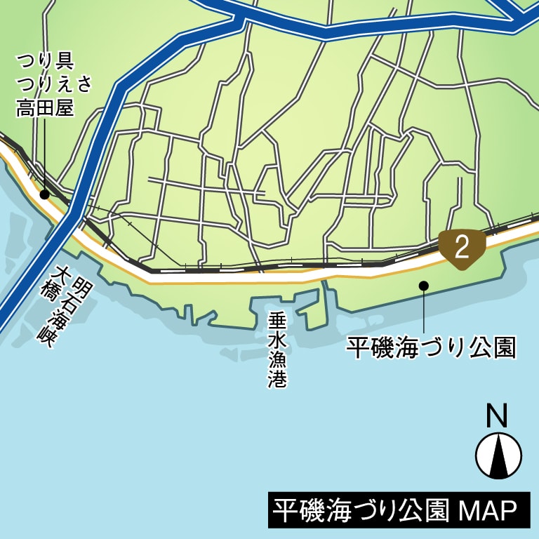 明石海峡の東出口にある平磯海づり公園は、東西1.4kmの護岸を整備開放した神戸市の施設。関西を代表する海釣り公園で、釣り場は平らで手すりがあり、子ども連れでも快適に釣りが楽しめます。園内には簡単な釣り具、仕掛け、エサなどを販売する売店、自動販売機もあり、身体障碍者用のトイレも完備しています。