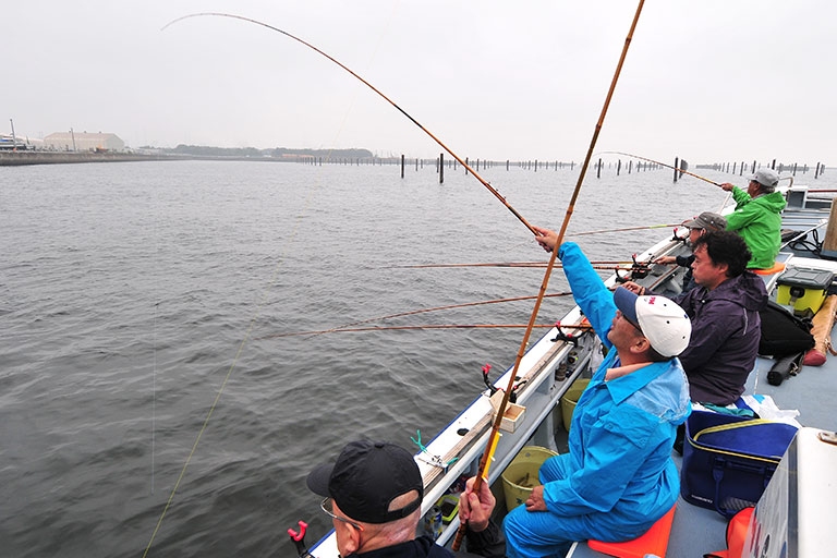ハゼ釣りでは、今も天然素材の和竿を好んで使う熱心なファンがいます。「ハゼの中通し竿」は、江戸和竿の代表的なジャンルの1つで、主に船の上で使います。左右に1本ずつハゼ竿を準備。船が釣り場に到着したら、左右の手に持ったサオを交互に上下に動かして、オモリでトントンと底を叩きハゼの食いを誘います。