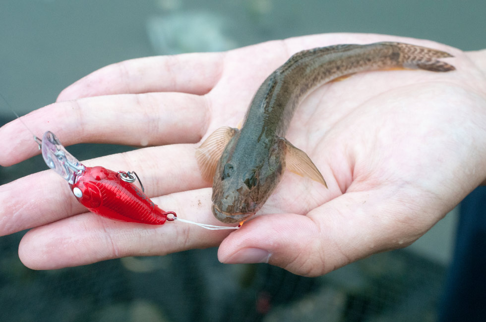 もう一つのルアー釣り(ハゼクラ)は、最近人気の釣り方で、管理釣り場でニジマスをねらうのと同じくらいの大きさのクランクベイトを使います。クランクベイトはリールを巻くと水中に潜り込むので、その動きを利用して、連続的に底をなめるように動かします。すると、周囲にいるハゼが、「エサを見つけた仲間がいるのか?」と興味を持って集まって来て、その時にハリ(ハリが光ることでエサのように見えているのでは? と言われます)に食い付いて釣れます。