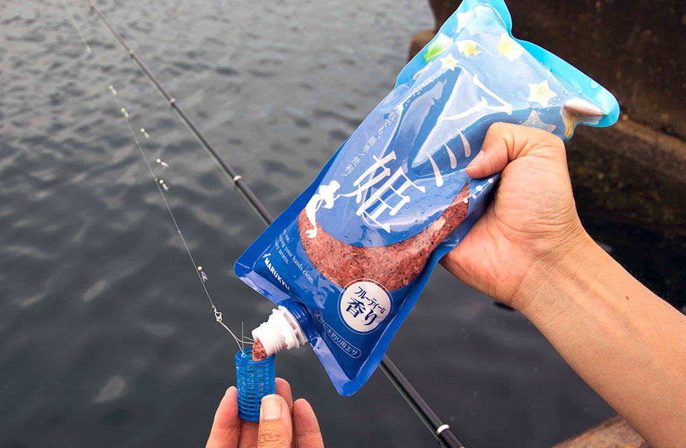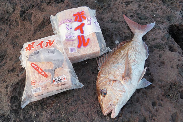 それらの釣りでは、ハリに刺す付けエサと、匂いや味で魚を集めるためのエサがあり、後者は寄せエサ、撒きエサ、コマセなどの呼び方がありますが、なかでもよく使われているものに、「オキアミ」や「アミ」があります。