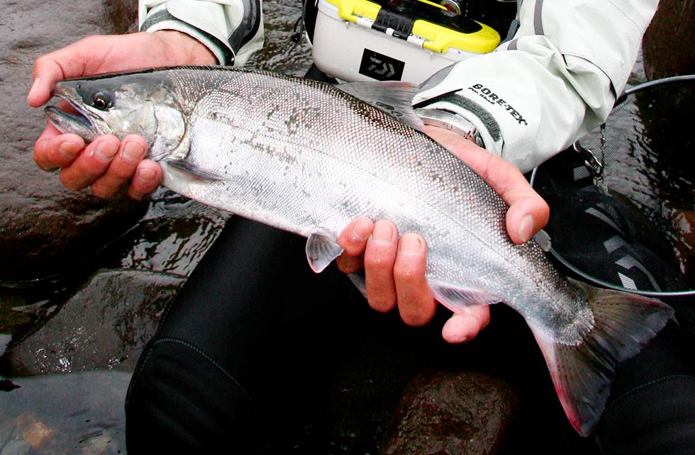 サクラマスやサツキマスとシロザケの間には違いもあります。シロザケは秋に川を遡ってきますが(これを遡上といいます)、サクラマスとサツキマスは春に遡上します。そして名前のとおり、サクラマスはサクラの花が咲く4月頃、サツキマスはサツキの花が咲く5月頃が川を遡るピークです。そのまま川の中にとどまりながら、秋までになるべく上流部まで移動して(夏の下流部は水温が高すぎて棲息できないため)ペアになって産卵します。サクラマスとサツキマスは、川魚の中では大ものであり、さらに姿形も抜群に美しいので釣りでも人気です。