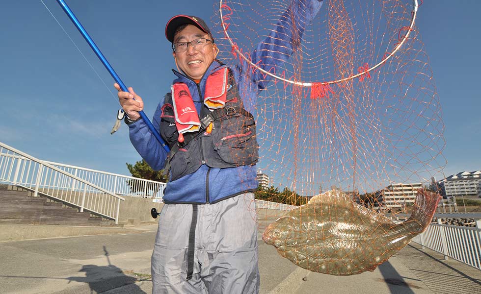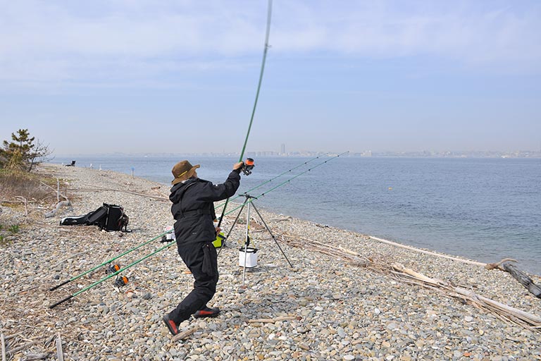 どのようなアタリでも、とりあえずはサオ先を下げてラインを送り込んでやります。10秒ほどしてからサオ先で聞いてやり、グッグッとエサ(仕掛け)を持っていくようであれば、サオをあおって合わせてから巻き上げます。この時、ラインのテンションを緩めず同じ速度で巻くことが大切です。途中で緩めるとバラシの原因になるので注意しましょう。時々、サオ先がチョンチョンと揺れてからラインがフワーッとたるむことがあります。これは沖から来たカレイがエサを食って手前に泳いだために出る現象です。大型カレイに多いアタリの出方なので、慎重に合わせて取り込むようにしてください。