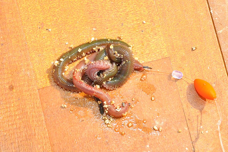 戻りガレイの時期は比較的エサ取りが少ない時なので、エサは大きめに付けるのがよいでしょう。2本バリ仕掛けの場合、下バリにはアオイソメの房掛け、枝バリにはイワイソメを付けるようにしています。1本バリの場合はイワイソメをハリスまでたくし上げ、ハリ先にはアオイソメを2~3匹付けます。イワイソメの臭いとアオイソメの動きでカレイを誘惑する作戦です。