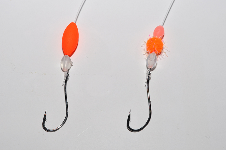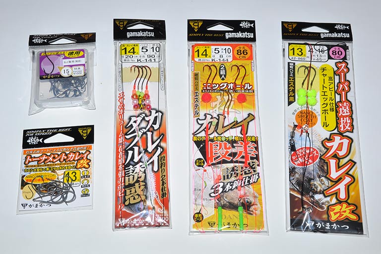 ハリは「大型カレイには大バリ」の鉄則どおり、カレイ専用の14~15号と大きめがおすすめです。そして、ハリのチモトにはカレイの目を引くためケイムラ玉、エッグボール、発泡流線シモリ玉などを装着します。これらは自作してもよいですし、装飾品の付いた市販仕掛けを活用するのもよいでしょう。高いクオリティーの商品が多くあります。