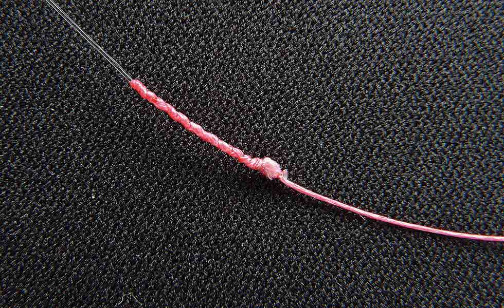 FGノットにはほかにもさまざまなバリエーションがありますが、実績のある釣り人が共通して挙げるポイントがあります。それは「編み込み途中の締め込み」と「ひととおりの編み込みが終わった時点での締め込み」の大切さです。大まかにいえば、PEラインをリーダーに編み付けていく過程で、まず1回ずつの編み付けがしっかり形を保つように適度な締め付けを意識します。そして、リーダー部分への編み付けが終わったところで、PEラインの本線とリーダーをゆっくりかつ強めの力で引き、編み付け部分全体をもう一度しっかり締め込みます。ここが多くの釣り人が現在共通して指摘するFGノットのコツで、適度な締め込みが行われたFGノットは、編み付け部分のPEラインの色が透明感のある濃い色に変わります。