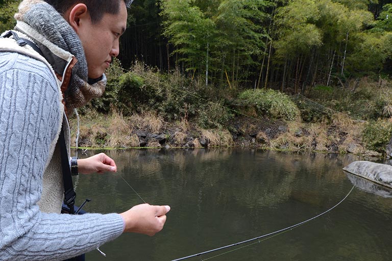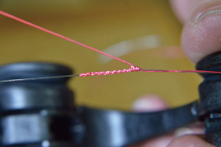 そうした中で、たとえばPEラインを手の中で保持するのではなく、ロッドにリールをセットした状態でPEラインを引き出し、その先端を口などで押えてPEラインを張っておき、そこにリーダーに編み付けていくなど、「こうすればいいのでは?」といった他のやり方も提案されるようになっていきます。