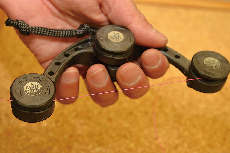 FGノットが登場した当初、まず紹介されたのは、PEラインを片方の手の指にぐるぐると巻き付け、PEラインが手の中で張った状態を作ったら、そこにリーダーを編み付けていく方法でした。この方法は釣り人ごとに改良が重ねられて現在でも有効ですが、一方で紹介されて間もない頃は、見よう見まねでやってみても、指に巻き付けたPEラインが途中で緩んでしまい、なかなか上手くできないなど、「FGノットはやっぱり難しい」と挫折する人も多くいました。