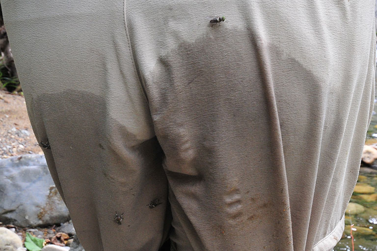 屋外に生息するカ(ヤブカ)のほかに、夏場の釣りで厄介な虫の代表格に、ヌカカとブユがいます。どちらも非常に小さく、羽音がしないためいつのまにか刺されてしまうのが特徴。虫除けスプレーもある程度の効果は期待できますが、完全に防ぐことは難しく、一番の予防は刺されやすい状況を予期して、肌の露出をしないことになります。特に注意すべきは朝夕の着替え時。釣りの最中は大丈夫だったのに、着替えのために手や足を露出させたわずかな時間に、ひどく刺されてしまったというケースがよく起きます。朝、サンダル履きで釣り場に到着し、クルマを降りて川のようすを見ていたら、いつの間にか刺されていたというのもよくあるケースです。