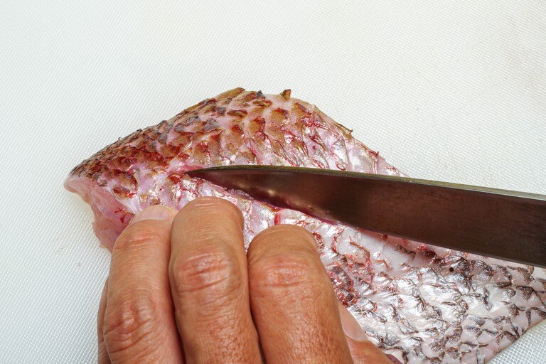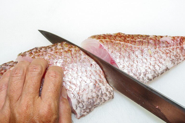 ウロコを落とし3枚におろした半身は腹骨を引かず、適当な大きさの切り身に切り分ける。また、中骨付きの2枚おろしでもよい。