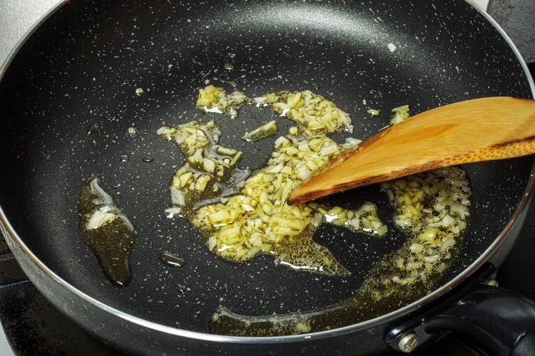 まずはフライパンにゴマ油を垂らし、ニンニクとショウガを香りが立つまで炒めたら……