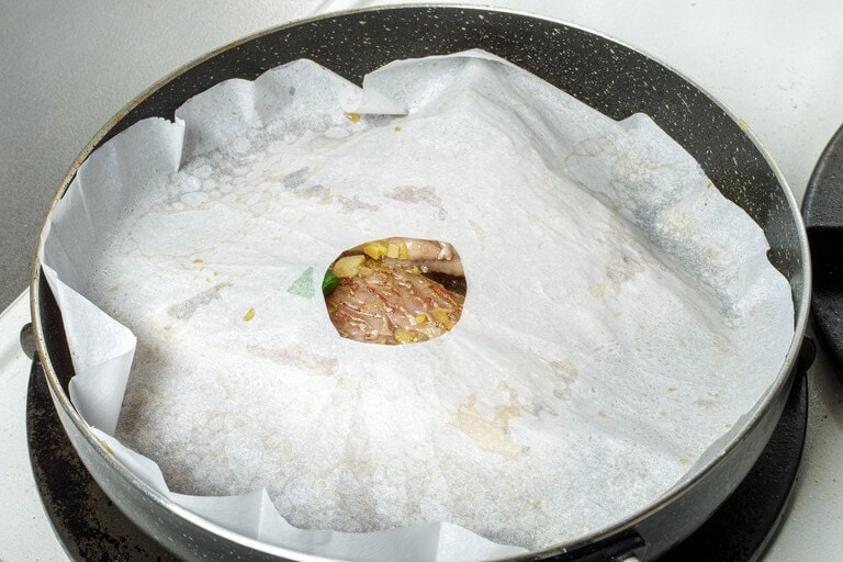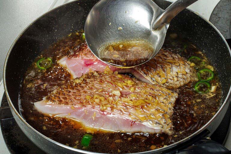 ここで皮目を上にして切り身を加えて玉じゃくしで煮汁を回しかけた後……