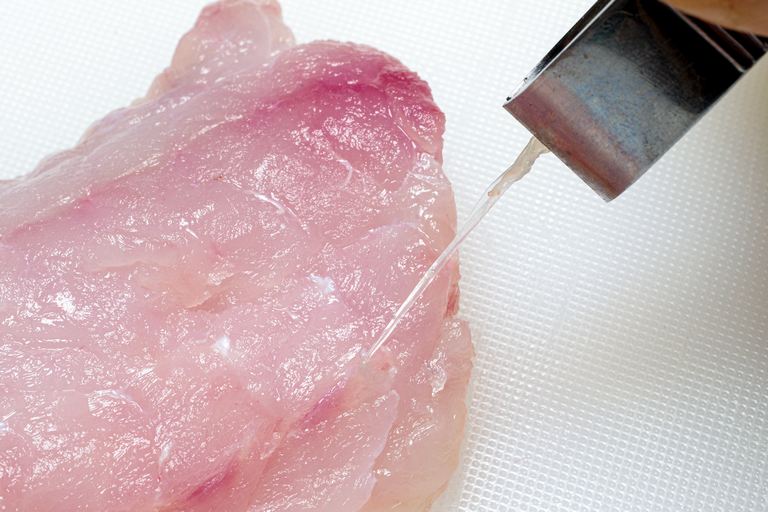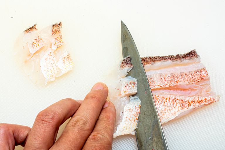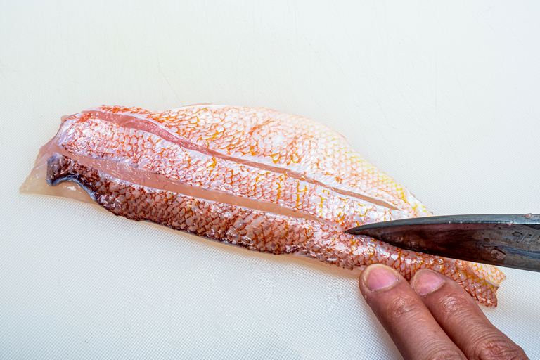ウロコを落とし3枚におろした身は、4本の節身に切り分けず半身のまま使用。まずは腹骨をそぎ落とし、血合骨を骨抜きで残さず抜き取る。