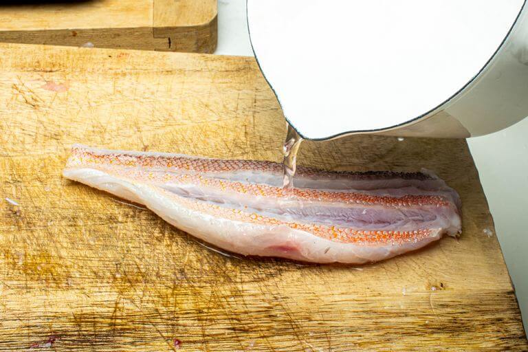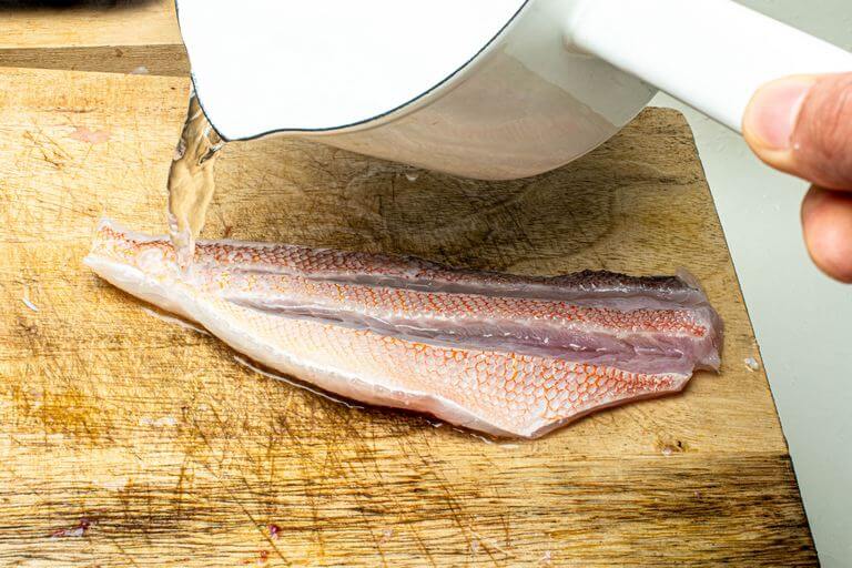 まな板を少し傾けて、皮目を上にしてアマダイを置いたら、尾の付け根から頭の切り口に向かって熱湯を掛ける。
