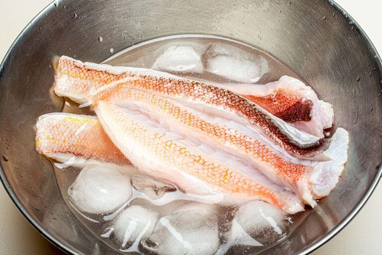 手早く氷水に浸す。冷めたら水気をふき取ったあと、乾いたペーパータオルに包んで冷蔵庫に15〜20分程度に入れておくと身が締まる。
