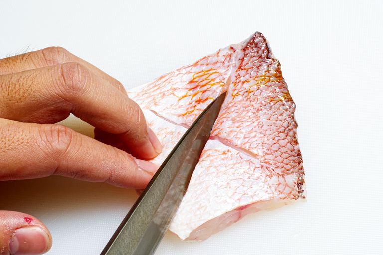 1人分の切り身に切り分け、皮目には×印の飾り包丁を入れておく。