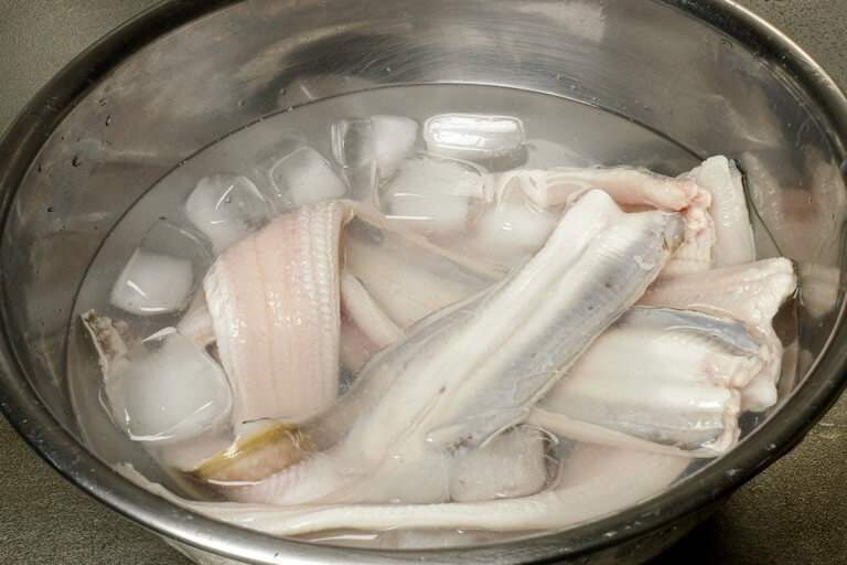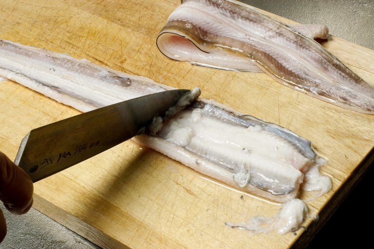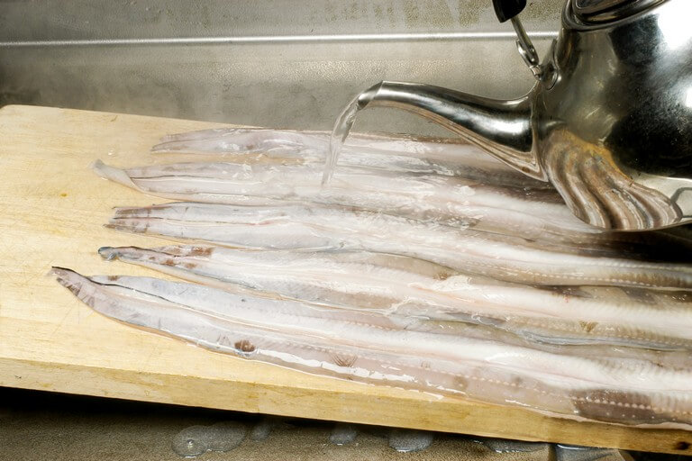 少し傾けたまな板に、割いたアナゴの皮目を上にして並べ、熱湯を素早く回しかける(これがヌメリ取りの作業になる)。