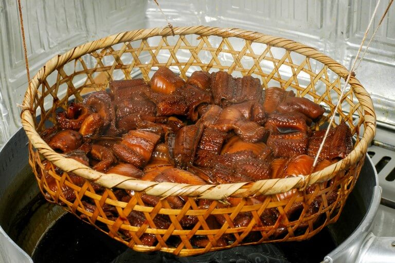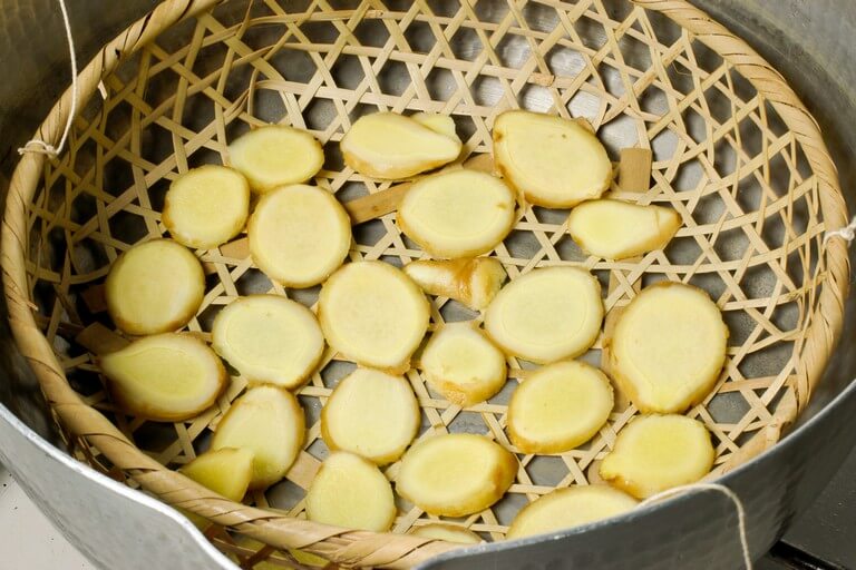 鍋底の焦げ付き防止として、ちょうど収まる直径の丸ザルを用意。タコ糸などでザルの左右に持ち手を付けておくと上げ下げしやすい。最初はザル底にショウガを並べておく。