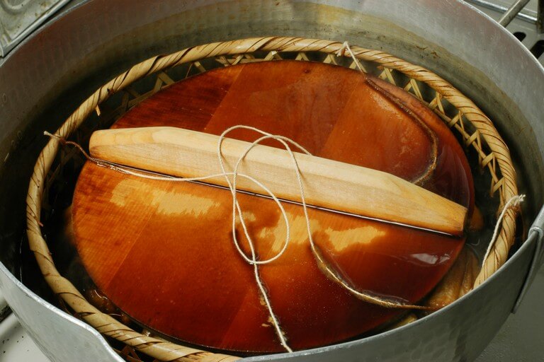 仕上げにミリンを加えて再び落とし蓋をして10分ほど煮たあと、ザルごと煮汁を切ってそのまま冷ませば出来上がり。